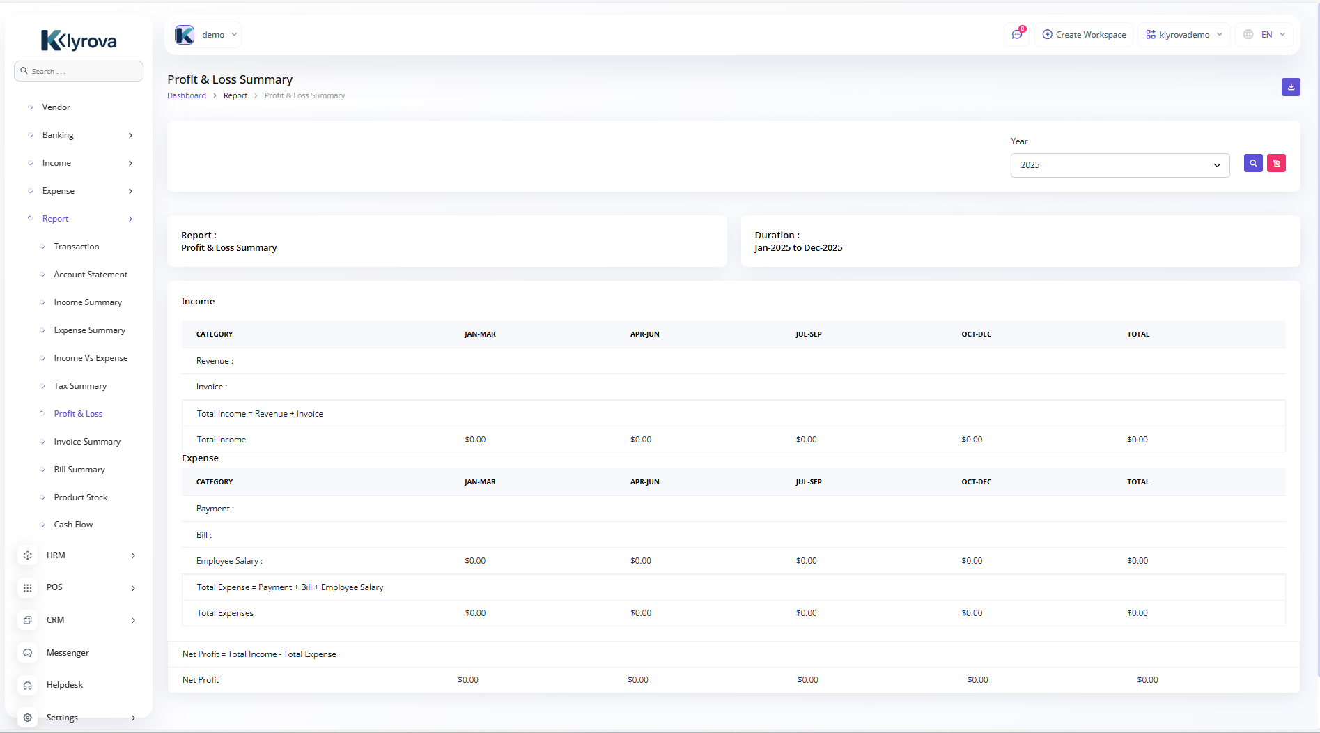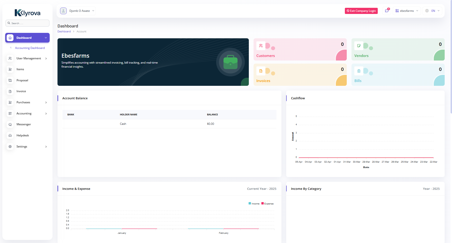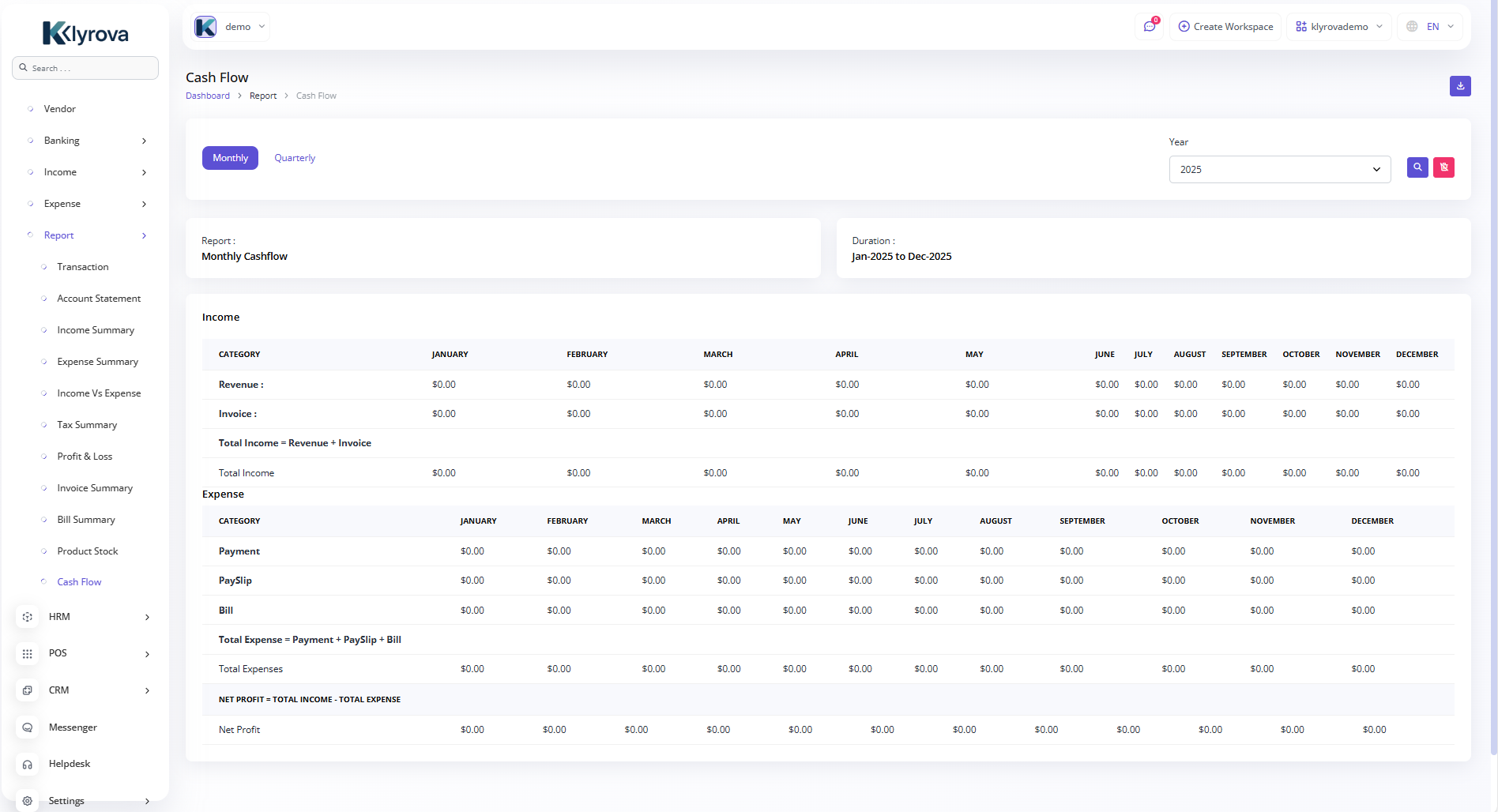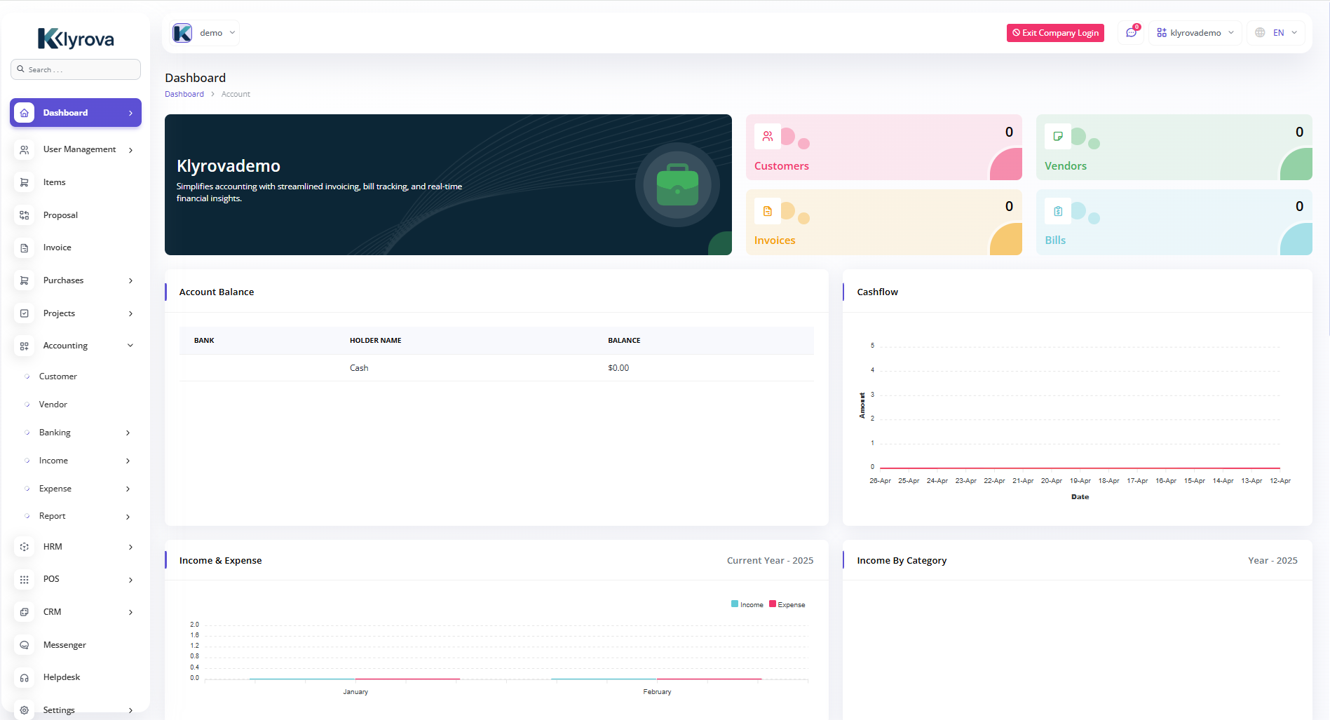 A budget is a financial plan for a specified period to keep in check with the working capital. This feature here helps to maintain the capital flow. You can set monthly, quarterly, half-yearly, or yearly budgets according to your business plans and needs. The main categories are “Income” and “Expense” where one can edit /update /delete the sub-categories as well.